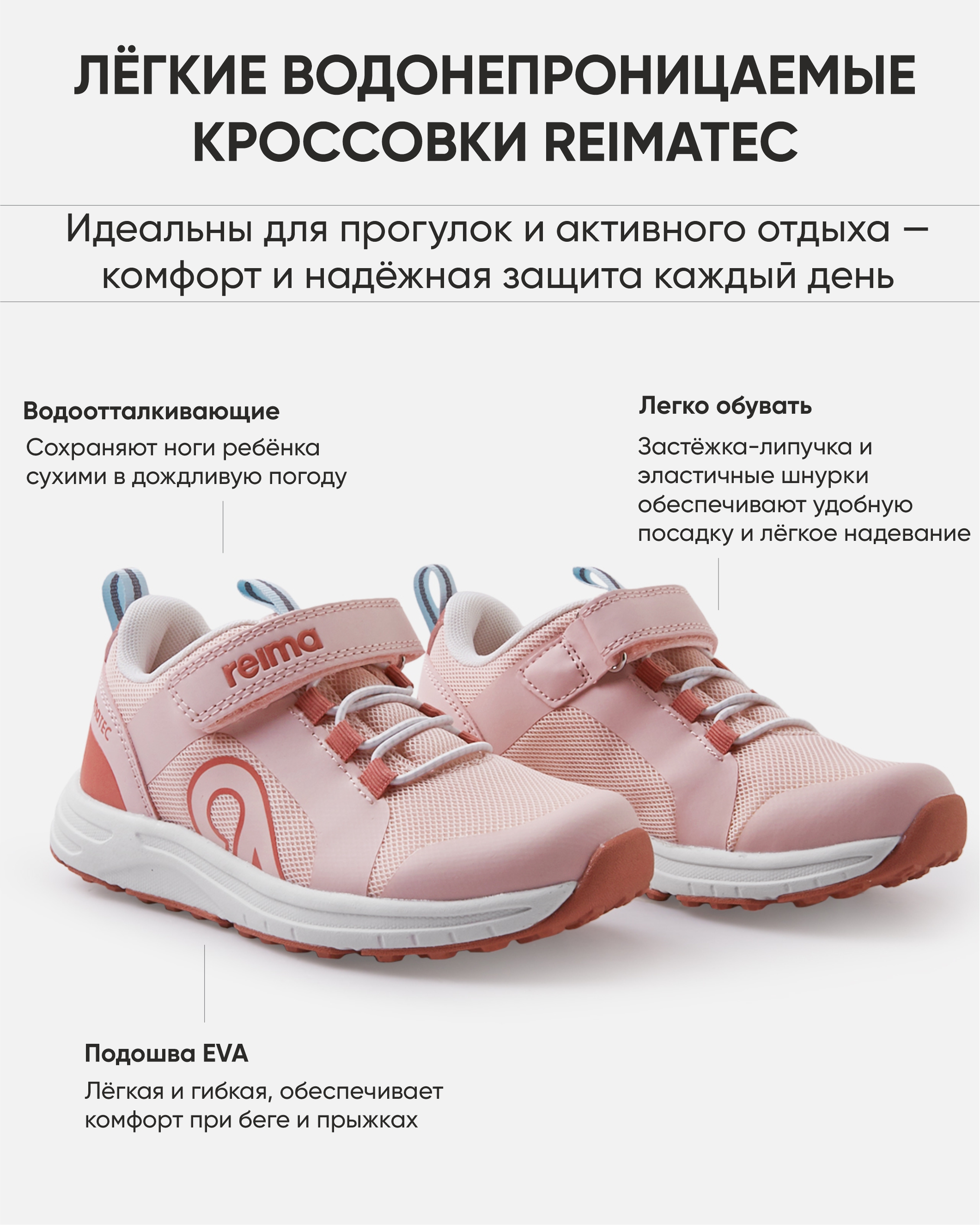 Дети любят играть на улице в дождливую погоду? Не проблема! В этих водоотталкивающих кроссовках из коллекции Reimatec маленькие ножки могут с радостью наслаждаться игрой, оставаясь всегда сухими. Подошва из EVA от Reima такая гибкая и легкая, что гарантирует удовольствие от бега и прыжков. Благодаря вставкам с проклеенными швами, сетчатой подкладке и съемным стелькам Happy Fit эта модель идеально подходит как для игр на свежем воздухе, так и для школы. Эластичные шнурки с застежкой-липучкой помогают детям легко и быстро надеть эти кроссовки.