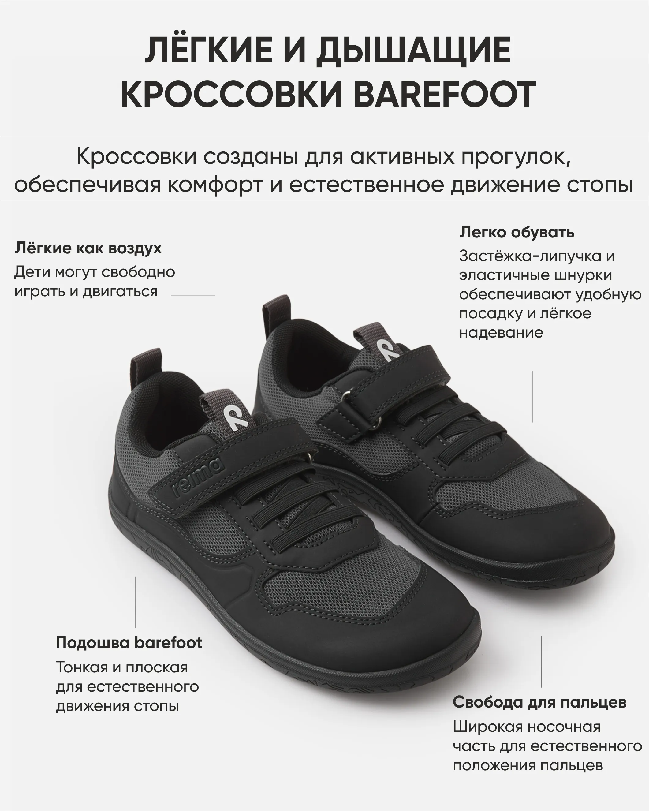 —Резиновая подошва обеспечивает отличное сцепление с различными поверхностями, поэтому ваш ребенок может бегать, прыгать и играть без опасений.