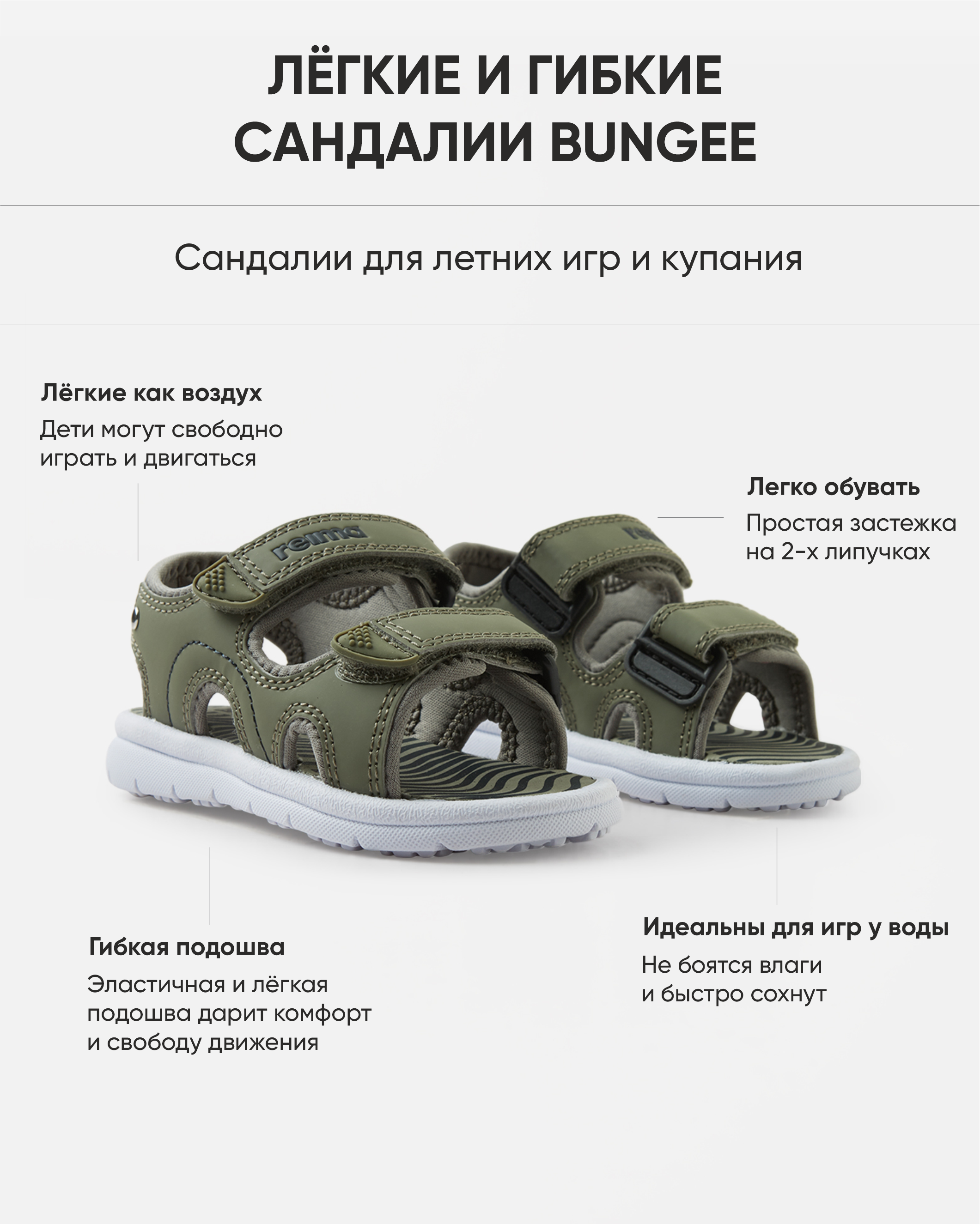Детские сандалии для малышей Reima подходят для игр у воды и купания — модель не боится воды и быстро сохнет.