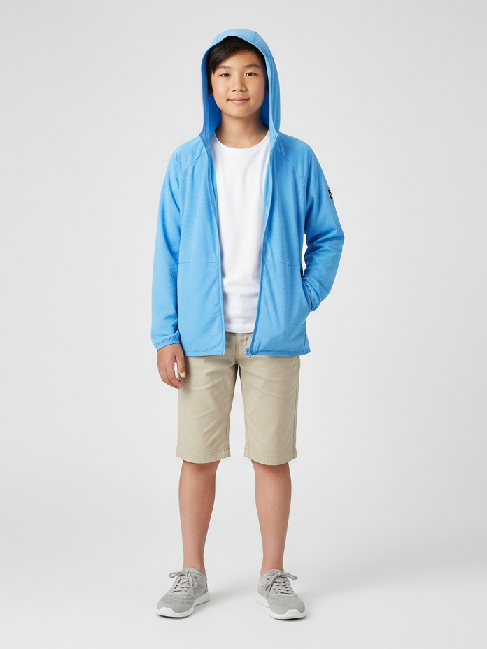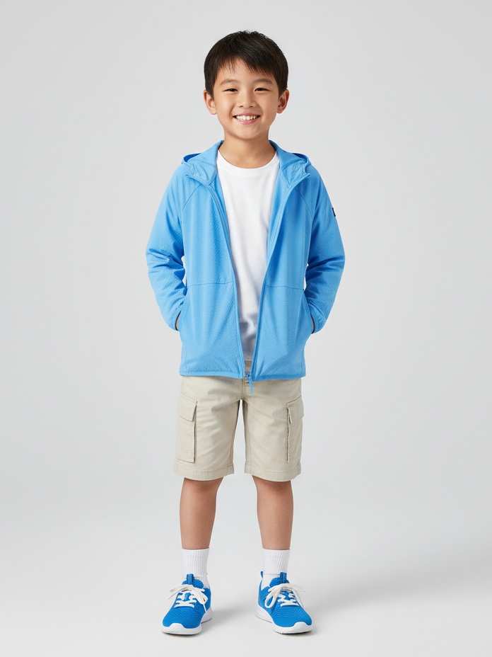 Охлаждающий летний кардиган Cooli ! Этот кардиган может похвастаться воздушным, эластичным материалом, который обеспечивает гибкость для активных игр, а также гарантирует детям свежесть во время их приключений: очень легкая ткань приятно охлаждает кожу, поэтому она идеально подходит для теплых дней. Фиксированный капюшон обеспечивает дополнительную защиту, а передняя молния позволяет легко надевать кофту. Кроме того, два боковых кармана идеально подходят для хранения сокровищ, найденных по пути. Позвольте детям исследовать мир комфортно и стильно в детской кофте Cooli.